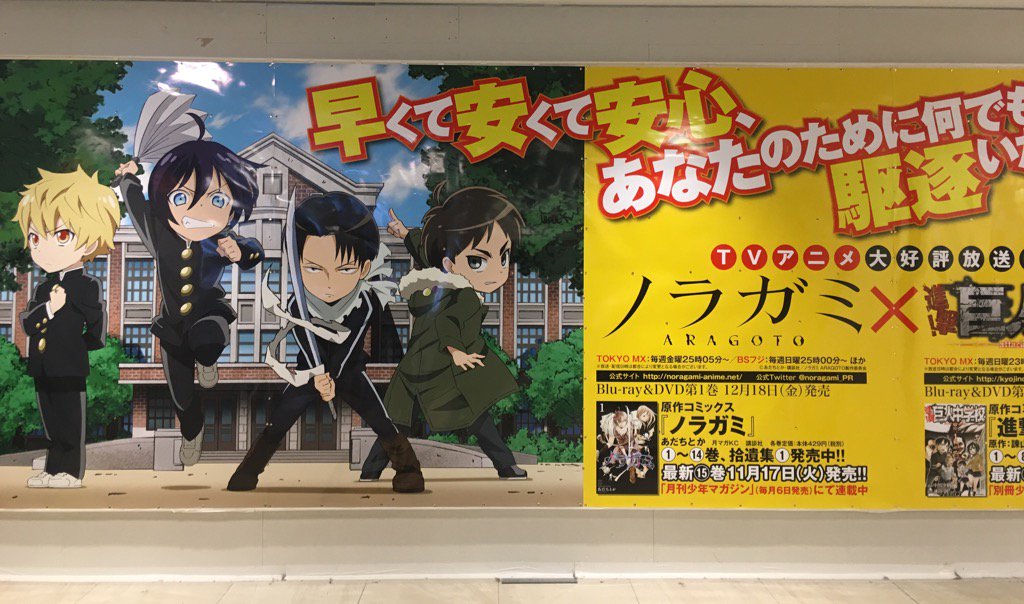 「ノラガミ ARAGOTO」×「進撃!巨人中学校」のコラボビジュアルが解禁されました!!本ビジュアルの露出場所やコラボレーションの詳細はこちらからご確認ください♪ goo.gl/Bm1rBx #ノラガミ pic.twitter.com/w3oxxCFFnO
